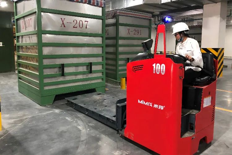 MIMA米玛10吨重载搬运车在搬运该货物时,通道只需要5米左右即可完成直角堆垛。定制化的起升平台平稳进入货物底部平稳提起该货物。驾驶员为坐姿驾驶,安全舒适。同时该车辆配备了蓝光警示灯、人员安全检测装置及视频摄像头等装置,更加保证了车辆在作业时的高安全性。