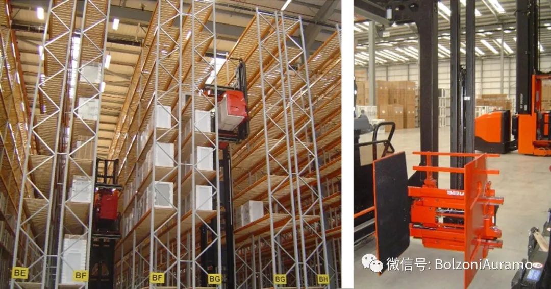 博索尼奥拉茂纸箱夹,用于VNA应用。在非常狭窄的通道中,从货架上夹取物料是一个挑战。空间有限、物料流量高以及操作安全是VNA应用的关键。