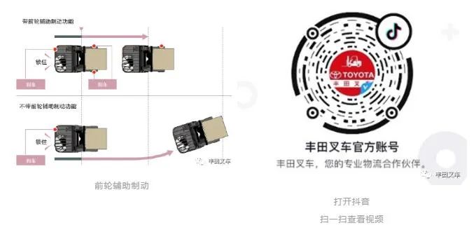 站驾式前移式叉车负载时,施加在驱动轮上的对地面压力比前轮小,容易打滑,不好控制。丰田在前承载轮上安装了辅助制动器,在负载行驶或在湿滑路面行驶时,可配合驱动轮制动获得切实的制动力,缩短制动距离,减轻制动过程中的甩尾现象。