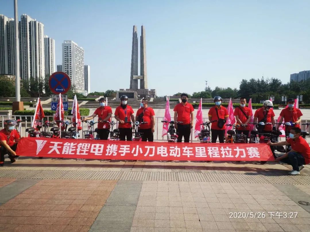 活动当日,小刀电动车作为唐山站拉力赛的合作方,提供了十余辆新国标电动车,参赛的电动车全部配备天能锂电48V12Ah模块电池。每一辆电动车都插上了红色的刀旗,排列整齐,在明媚的阳光下熠熠生辉。