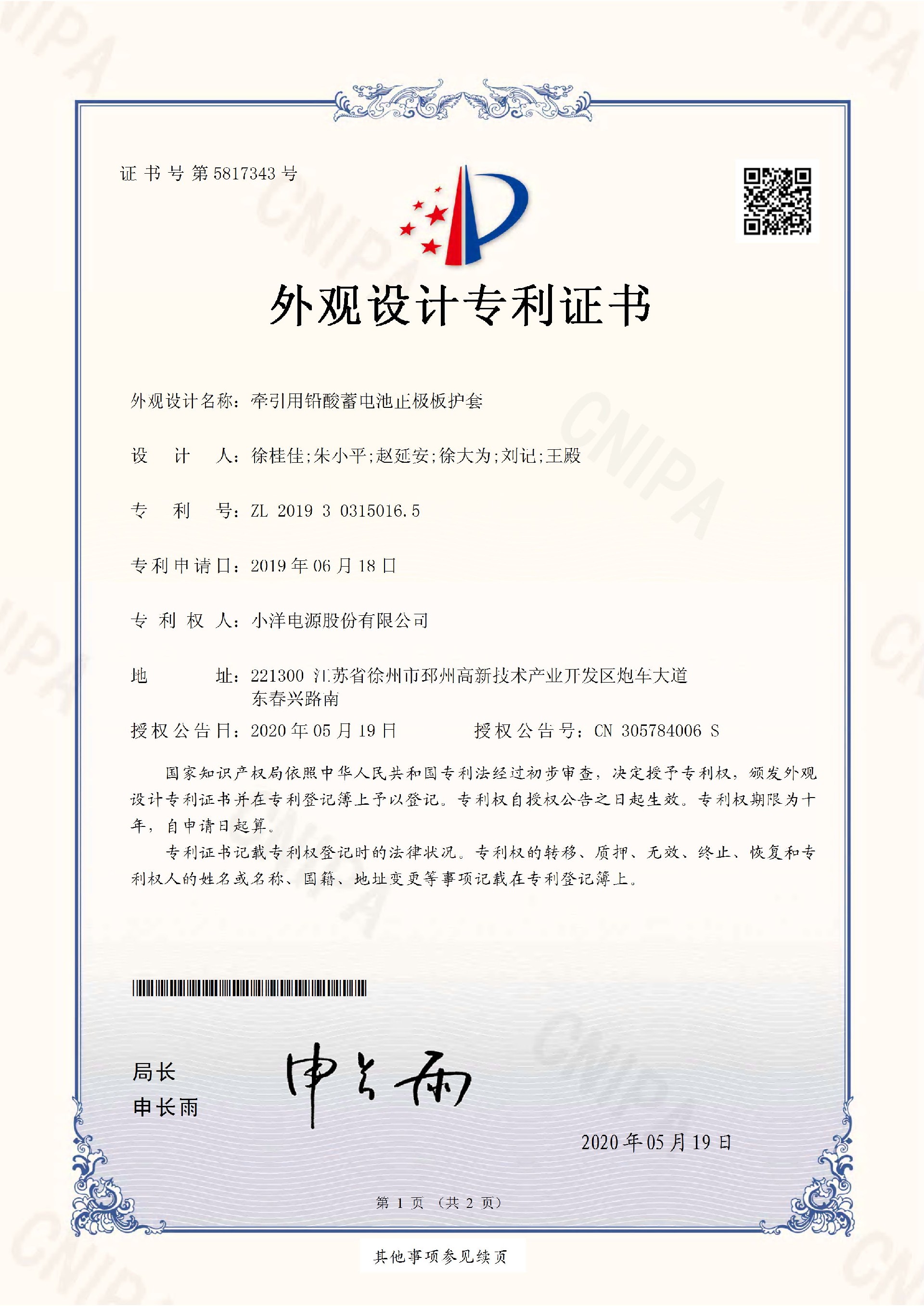 由小洋电源股份有限公司自主开发设计,用于叉车电池的三个关键零部件——牵引用铅酸蓄电池极柱铜芯、牵引用铅酸蓄电池极柱、牵引用铅酸蓄电池正极板护套,获得“外观设计专利”授权。