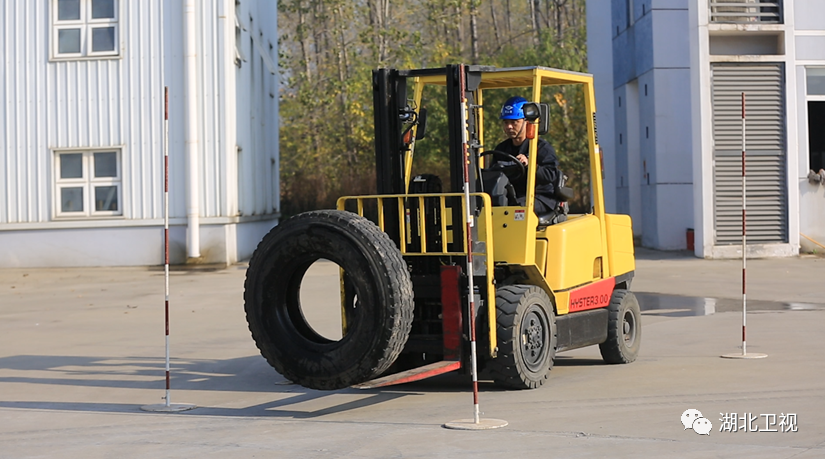 在三分钟之内操作叉车,依次将两个轮胎稳稳地放在两个距离地面分别为1.2米和1.5米、直径30厘米的铁托盘上。张祥现场演示绝活儿“叉车竖轮胎”湖北省技术能手张祥...