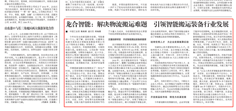 2020年6月17日,龙合智能装备制造有限公司(协会副会长单位)荣登《中国工业报》20200617期A2版,具体报道如下: