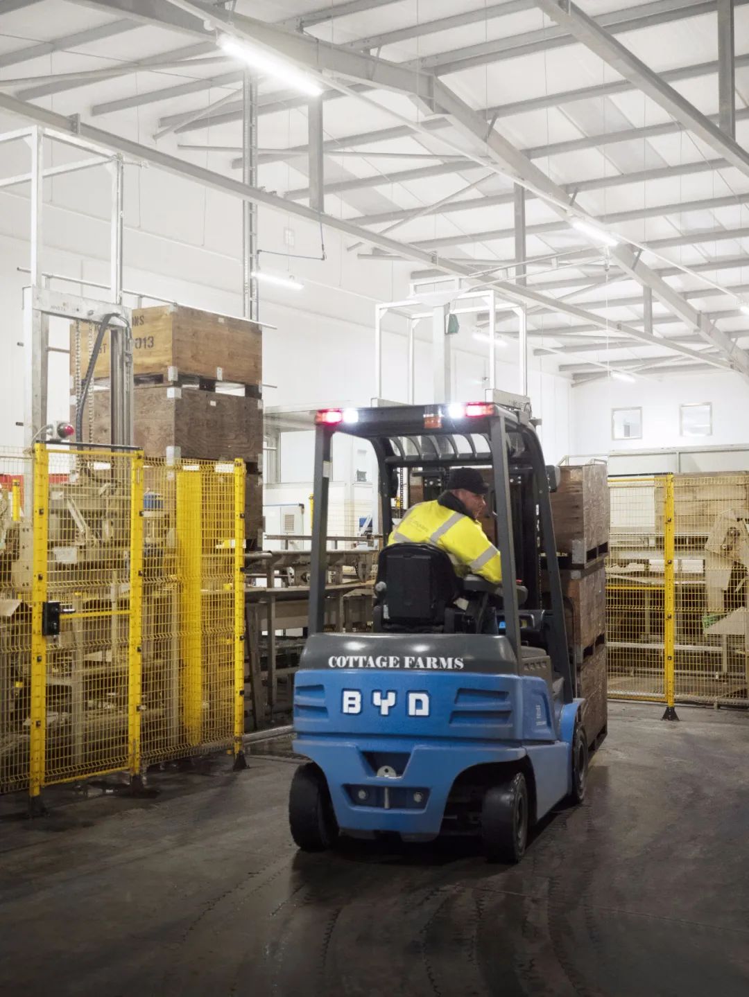 “原始的车队规模超过28台,”他说,“我们可以缩减车队规模,Cottage Farms有一些额外的设备给铅酸叉车作为备用,以防车辆未能完全充电。也就是说他们的设备比实际需要的要多。我们计算出我们不需要将所有28台设备从铅酸换成比亚迪,但我们有自信能将车队减到易于管理的数量并在此过程中为Cottage Farms省钱。”