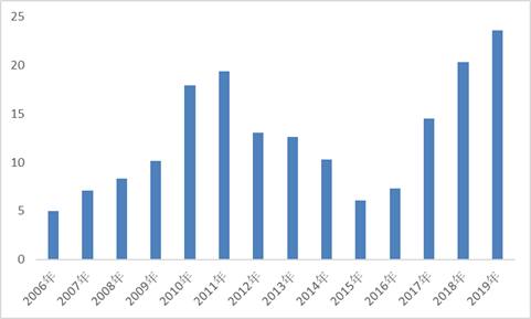 图3 国内挖掘机历年销量(单位:万台) 数据来源:工信部,氢云链