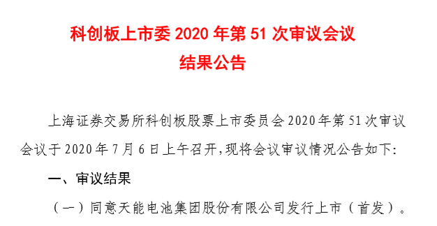 上海证券交易所科创板股票上市委员会2020年第51次审议会于2020年7月6日上午召开,同意天能电池集团股份有限公司发行上市(首发)。