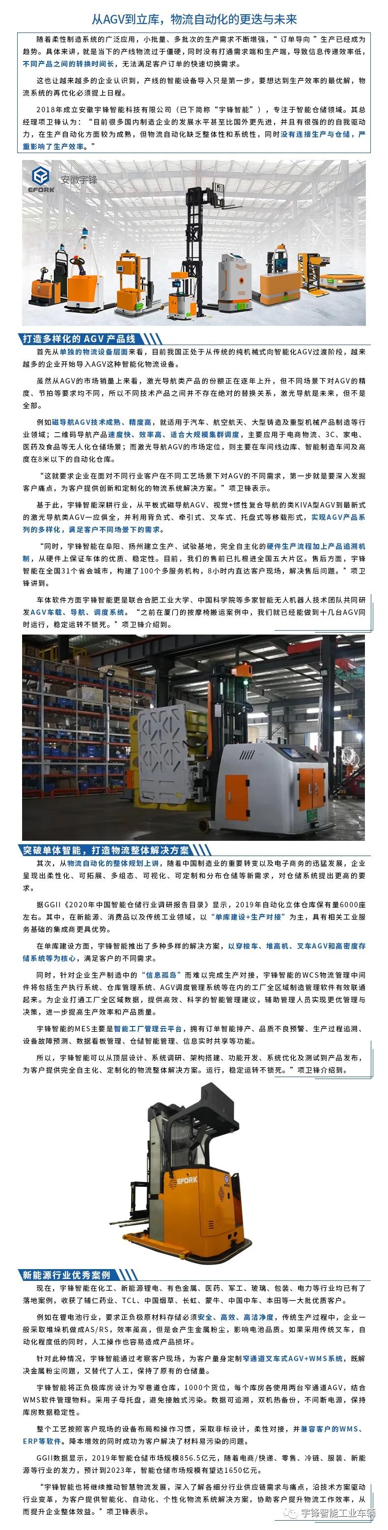 安徽宇锋智能科技有限公司作为国内领先的智能物流系统集成服务商与智能装备制造商,专注于智能仓储、智能车间、平台系统等多元化业务,致力于为多类型客户提供定制化的咨询规划、系统集成、软件研发、智能装备生产、电控协同开发、安装调试培训、质保售后服务于一体的一站式智慧物流系统整体解决方案。