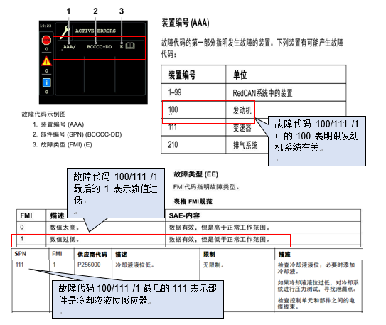 综合以上信息,故障代码100/111 /1 说明发动机冷却液液位低。