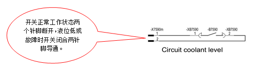 进一步检查测量机车冷却液液位传感器,发现液位传感器两个针脚常通。依据机车电气原理图,当冷却液液位正常时此开关断开,当冷却液液位过低时此开关闭合,并向Volvo发动机控制单元(D7940)发送一个24VDC信号。