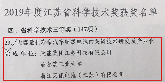 3月17日,江苏省政府发布《关于2019年度江苏省科学技术奖励的决定》,沭阳公司的《大容量长寿命汽车超级电池的研发与产业化》项目获选,这是天能坚持科技创新、加快转型升级结出的又一硕果。