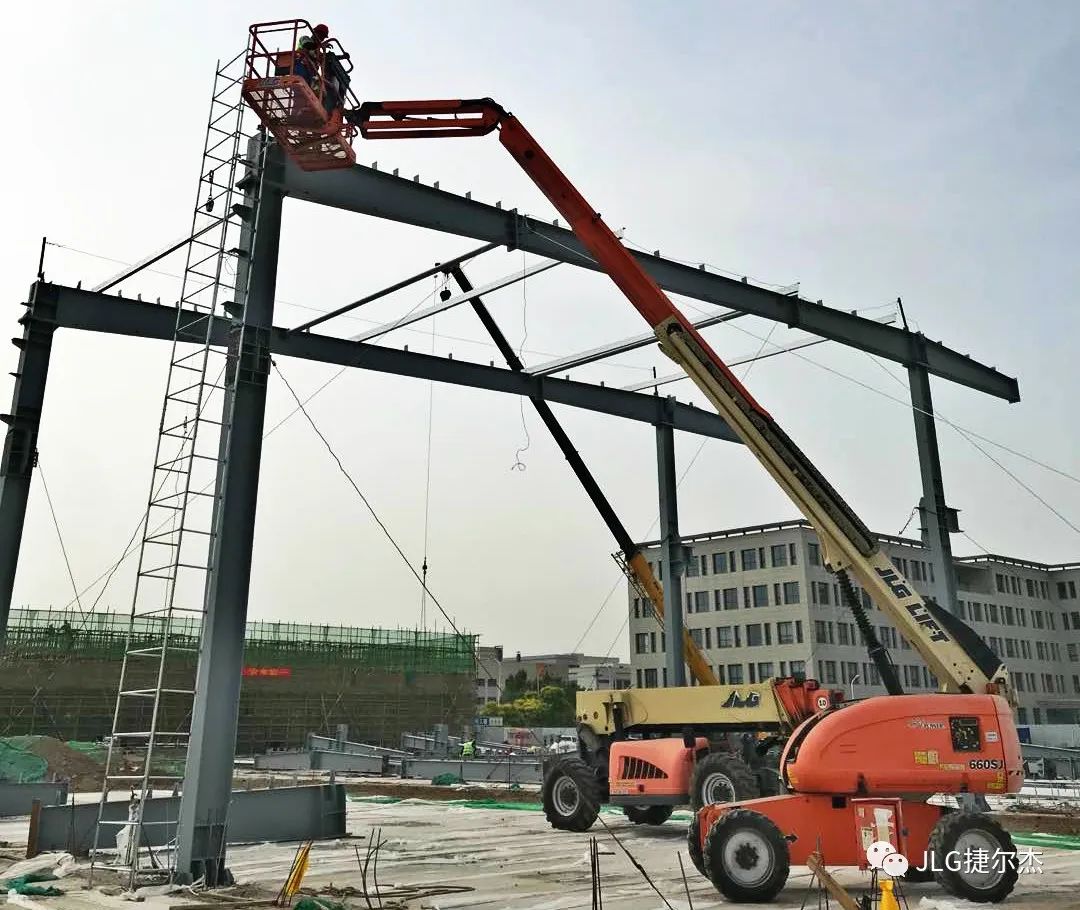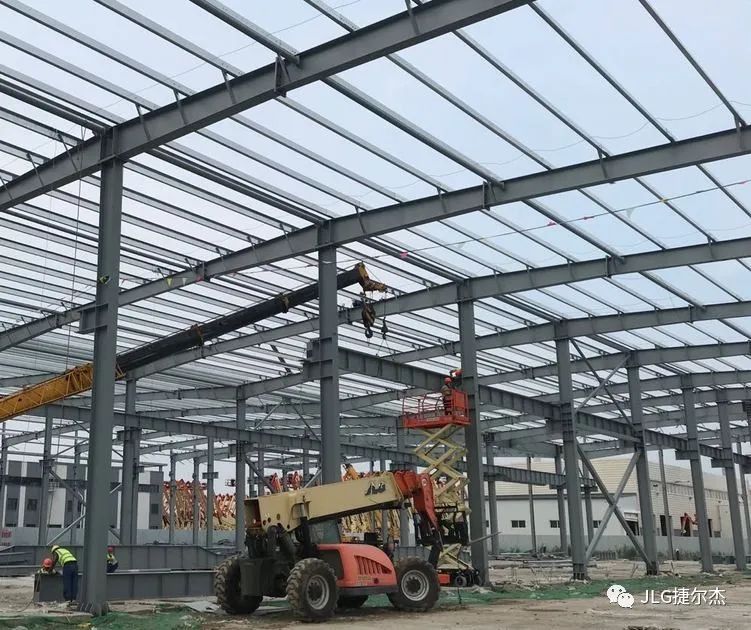 据工地负责人介绍,捷尔杰在智能工厂项目规划初期就向施工单位推荐了使用高空作业平台和伸缩臂叉装车来安装钢结构。