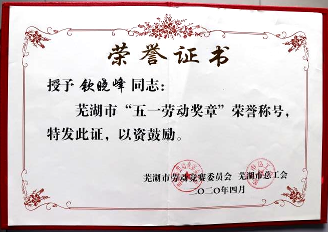 ❂【芜湖公司】近期,芜湖市劳动竞赛委员会、市总工会表彰一批为芜湖市经济社会发展作出突出贡献的单位、先进个人和集体,芜湖公司总经理钦晓峰获芜湖市“五一劳动奖章”绶带和奖状。