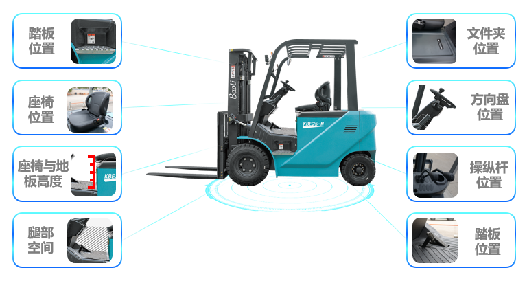 宝骊KBE20/25-N系列融入了更人性化的人机工程设计理念,在座椅高度、腿部空间、方向盘尺寸、操纵杆位置等多方面悉心考量,根据人体工程学原理,改良并完善设计,让操作者使用起来更舒适,减轻长时间作业的疲劳感。