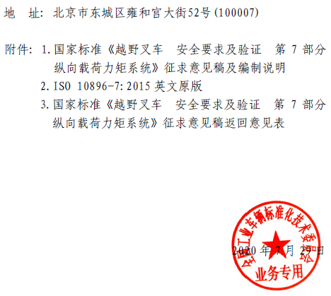 关于对国家标准《越野叉车 安全要求及验证 第7部分:纵向载荷力矩系统》(征求意见稿)征求意见的函