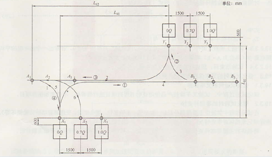 叉车强化试验场地需要专业布置及特定运行路线,以电动平衡重式叉车强化试验为例,空托盘、辅助试验载荷0.7Q和试验载荷Q,分别置放在场地特定位置X1、X2、X3处,试验过程中的负荷分配量分别占20%、50%和3o%;中货位起升,在X1、X2、X3处,起升高度为2/3H;高货位起升,在Y1、Y2、Y3处,起升高度为1.0H。试验过程中的起升高度分配量各占50%。中货位起升,在凡、凡和朽处,起升高度为⒉3刃;高货位起升,试验过程中的起升高度分配量各占50%。