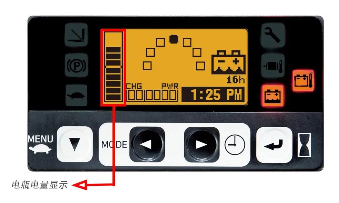 当电瓶过度放电时,会通过显示器警示,减少对电瓶的损伤。