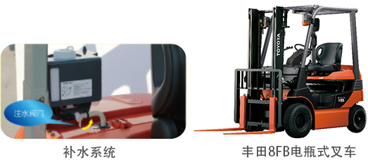 丰田的8FB系列电车配备带储水箱的补水系统。储水箱位于叉车的后立柱上,操作人员只需扭动注水阀即可为电瓶补水。令补水作业更轻松及时。