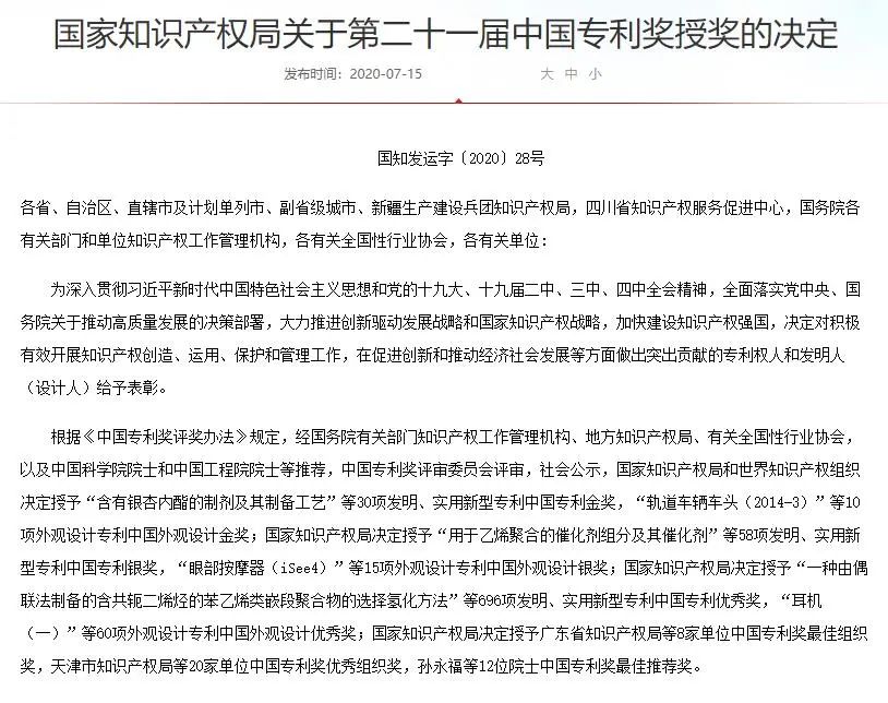 中国专利奖由中国国家知识产权局与世界知识产权组织共同评选并颁奖,是我国政府颁发的专利领域最高奖项。评奖标准不仅强调项目的专利技术水平和创新高度,也注重其在市场转化过程中的运用情况,同时还对其保护状况和管理情况提出要求。