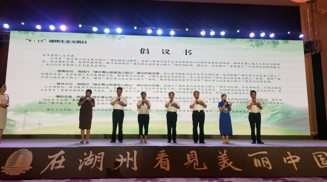 “我是张天任,我倡议,加快推动生产方式转变,积极促进经济生态化、生态经济化,不断擦亮‘在湖州看见美丽中国’金名片……”张天任与人大代表们用慷慨激昂的语调,共同为依法守护"绿水青山就是金山银山" 共建美丽湖州发出倡议。