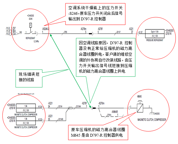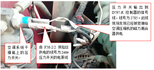 1、发动机启动后,F58-2/2保险丝正常供电给发动机控制器X279f插座6号针脚及干燥瓶上的压力开关。在机车开启前照明灯和其它灯光后,机车用电量加大,因改装了线路,此5A保险丝还需要给空调压缩机磁力离合器的线圈供电。空调压缩机磁力离合器突然吸合时,瞬间拉低了F58-2/2保险丝给发动机控制器6号熄火针脚的电压,当6号针脚电压低于熄火信号阈值时,发动机控制器视为收到熄火信号而关停发动机。