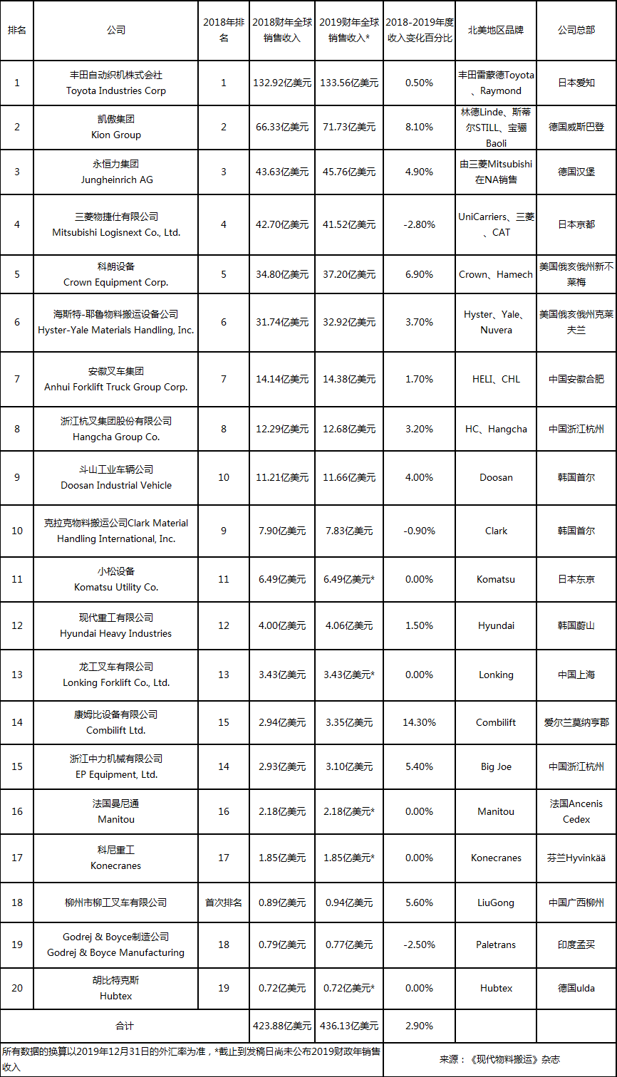 2019年全球20强叉车供应商排行榜(MMH排名)