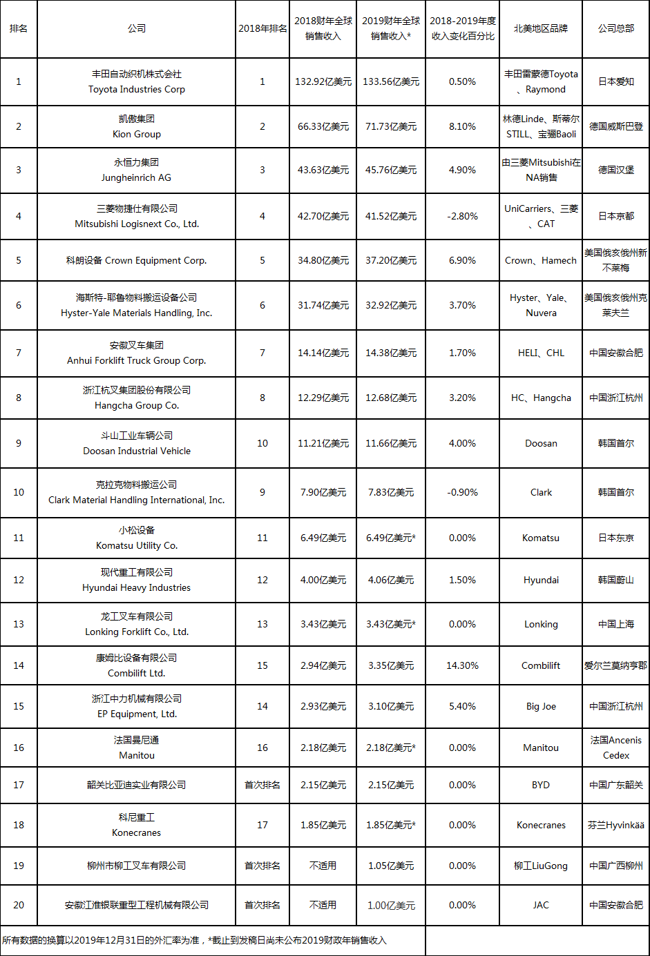 2019年全球20强叉车供应商排行榜(中叉网修正后排名)