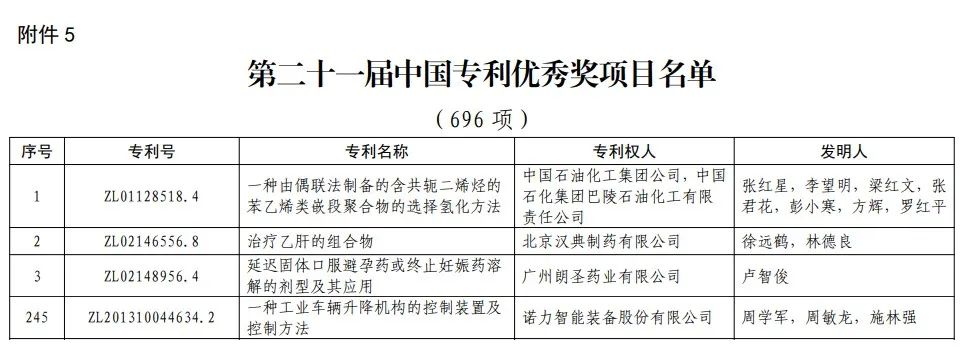 近日,国家知识产权局正式发布了关于第二十一届中国专利奖授奖的决定,诺力股份的发明专利“一种工业车辆升降机构的控制装置及控制方法”获得中国专利优秀奖,这也是公司首次获得中国专利奖。