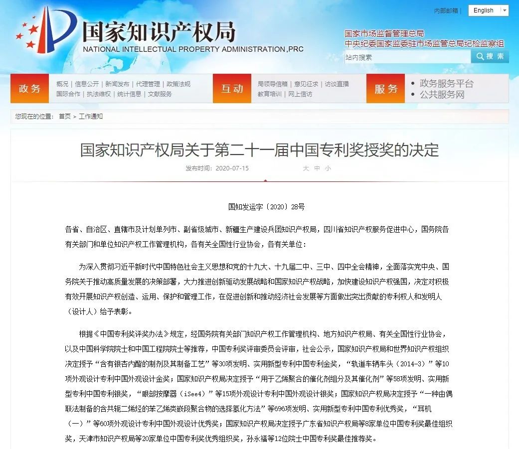 “中国专利奖”是由中国国家知识产权局与世界知识产权组织共同主办的,是我国专利领域的最高荣誉!评奖标准不仅强调项目的专利技术水平和创新高度,也注重其在市场转化过程中的运用情况,同时还对其保护状况和管理情况提出要求。据中国知识产权报的数据统计,本届评选共有2400多项专利参评,数量为历年之最。