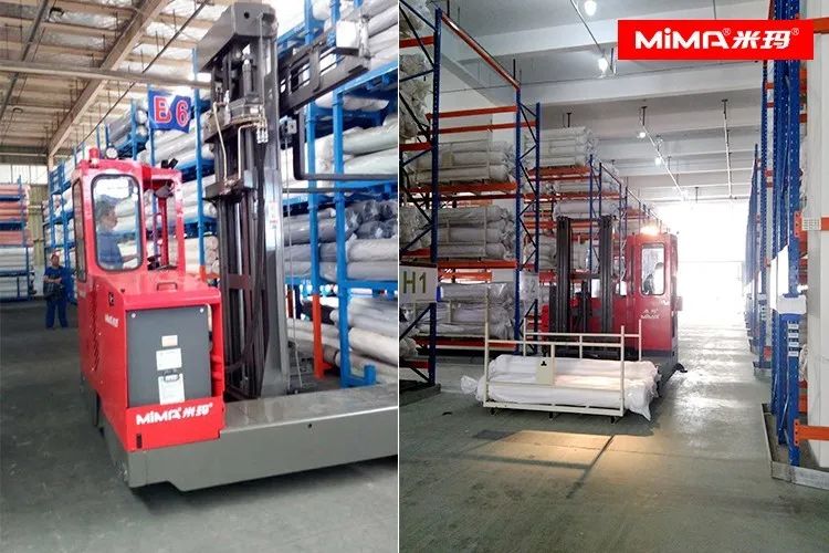 该企业是一家大型服装面料纺织企业,产品出口多个国家和地区,由于业务量的增长,仓储物流环节成本增加,用于货物存储的库房面积有限,且货物重量重,尺寸长,故需要一种窄通道密集存储和搬运解决方案。根据该客户的实际工况需求,MIMA米玛提供客户的高效解决方案为TFC系列座驾式全向叉车。