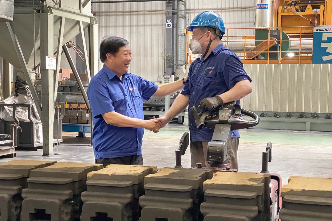 8月14日下午,正值伏天,秋老虎肆虐。谭旭光在潍柴滨海大缸径发动机铸造车间调研,看到一线铸造员工在极度高温炎热下,激情奋战,衣服都被汗水浸透了。谭旭光握着员工的手,含着眼泪说:你让我太感动了!你们的劳动奉献太伟大了!我谢谢你们!