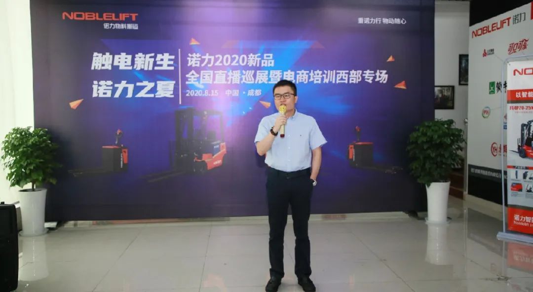 “触电新生 诺力之夏” 诺力2020新品全国直播巡展第二场——西部专场于8月15日在成都众鑫诺力机械设备有限公司4S店成功举行。诺力股份总经理助理顾梓城先生、成都众鑫诺力4S店总经理莘建强先生,以及西部大区的经销商代表们等共同出席此次活动。