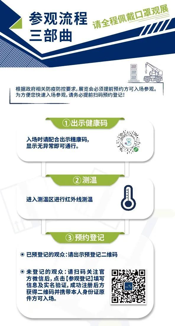 展会现场可能采取限流措施,请所有观众提前完成实名登记,以确保顺利获取入场名额,实名认证后所获取的电子卡证只限本人使用,不得转让或给予他人使用。没有实名预约登记,将不能入场参观!