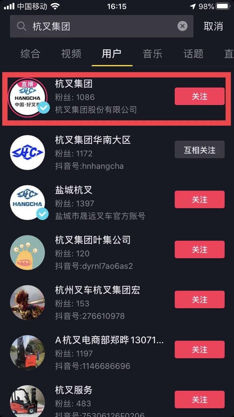 打开抖音APP,在左上角的搜索栏,输入“杭叉集团”