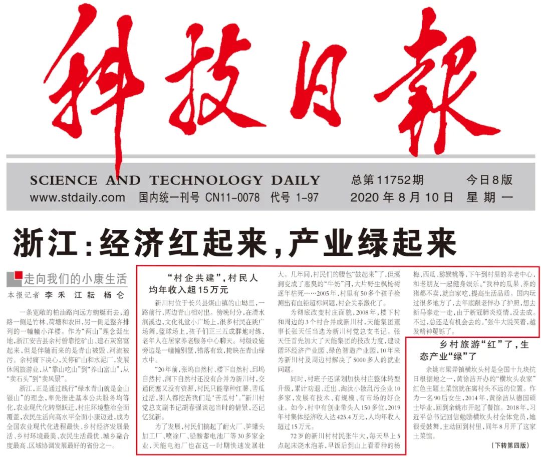 8月10日,《科技日报》头版刊文《浙江:经济红起来,产业绿起来》,报道了天能集团忠实践行“绿水青山就是金山银山”理念,通过“村企共建”,不仅让新川村的绿水青山回来了,还让村民的腰包“鼓起来”了,将新川从曾经的一个“苦瓜村”变成如今家家有别墅,户户有轿车的富裕村。