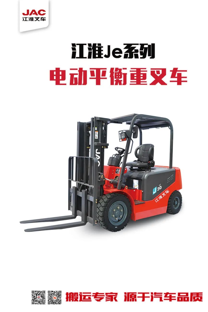 江淮Je系列3吨电动平衡重叉车工作环境适用范围广,配置经济耐用,极具性价比优势。