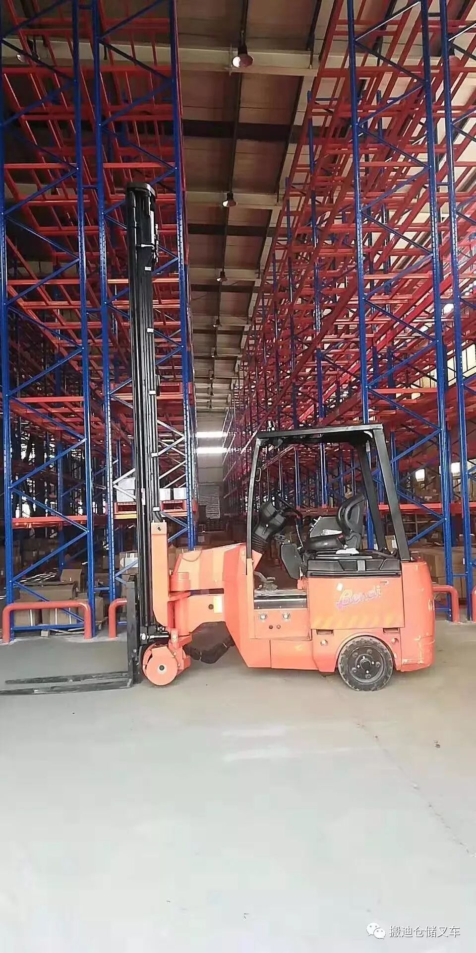 Bendi比较前移式叉车更高30%的存储量,作业效率提高30%;(前移式叉车的支腿提高了货架系统底层横梁高度,提高了货架系统的重心,底层货物搬运效率受到叉车支腿影响);