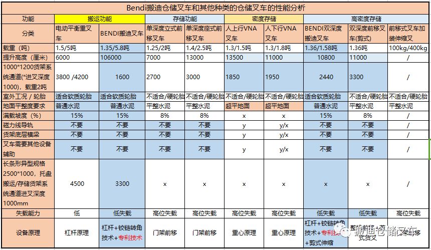 总结:无论是平衡式叉车、前移式叉车、VNA叉车,实现Bendi的设备功能,都存在一种不足,货架系统穿越巷道能力;大规格软质实心轮胎;稳定的门架;巷道能力;专利的门架220°摆角能力;载重能力;室内密度存储、室外装卸作业;等(下图列表分析)
