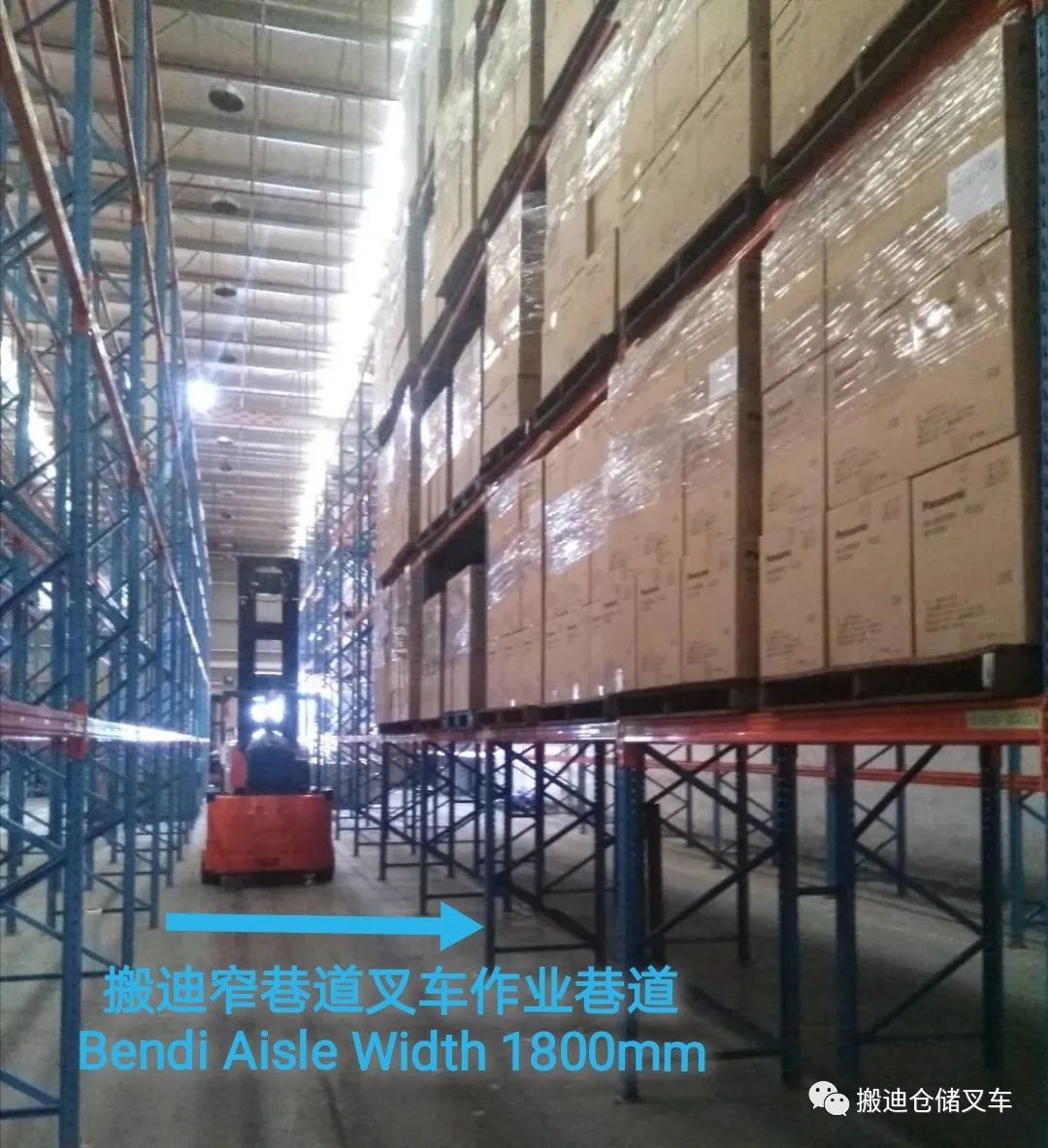 3、仓库资源的最大化利用:铰链叉车作业巷道2米,比较前移式叉车3.3米的巷道减少宽度方向1.3米,使得通道利用率提高1.3/2=65%,仓库空间容积率提高35%,仓库储能增长帮助企业增加35%的存储效益,使得企业有更多的盈利能力。