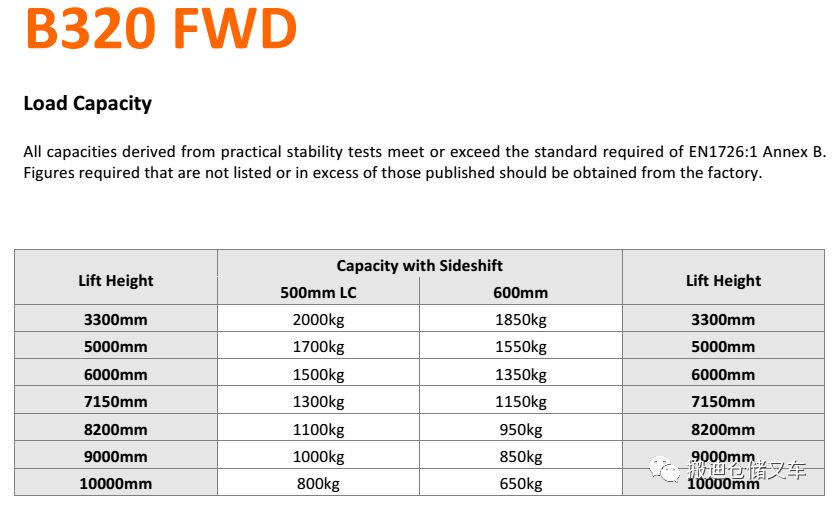 3.3米高度载重2000公斤/500mm载荷中心 ;
