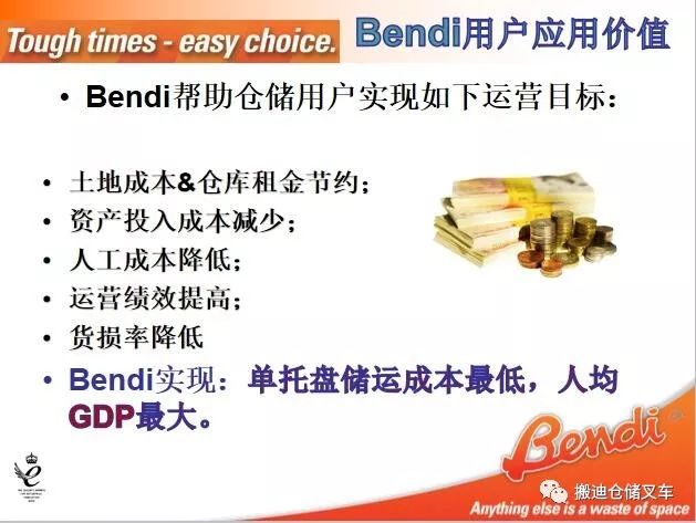 Bendi能够实现仓储空间70%左右的容积率,比较前移式叉车40%存储率高30%,比较平衡重叉车35%的存储率高50%,如果用户有1万平米的仓库在使用前移式叉车和3.3米巷道的货架系统,使用Bendi无限制窄巷道叉车,可以实现3000平方的仓库租金的节约,用户每年节约的费用为50元/月/平方*3000平*12月=180万/年。这相当于用户企业多获得了180万的税后利润,或者有180*20=3600万的营业额增加。