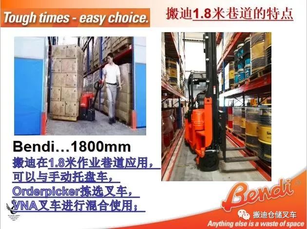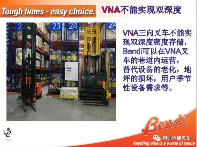 Bendi除了室内外工况适用,比较VNA三向叉车能穿越货架巷道,提高作业效率