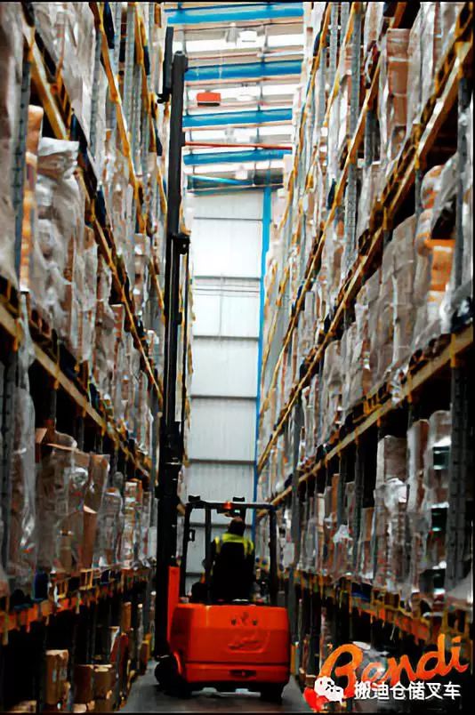 Bendi搬迪铰链叉车作业时,门架转动220°,1.8米作业巷道,举升货物和倒车出库的过程中,车体通道内居中,原地驻车,不会磕碰货架系统: