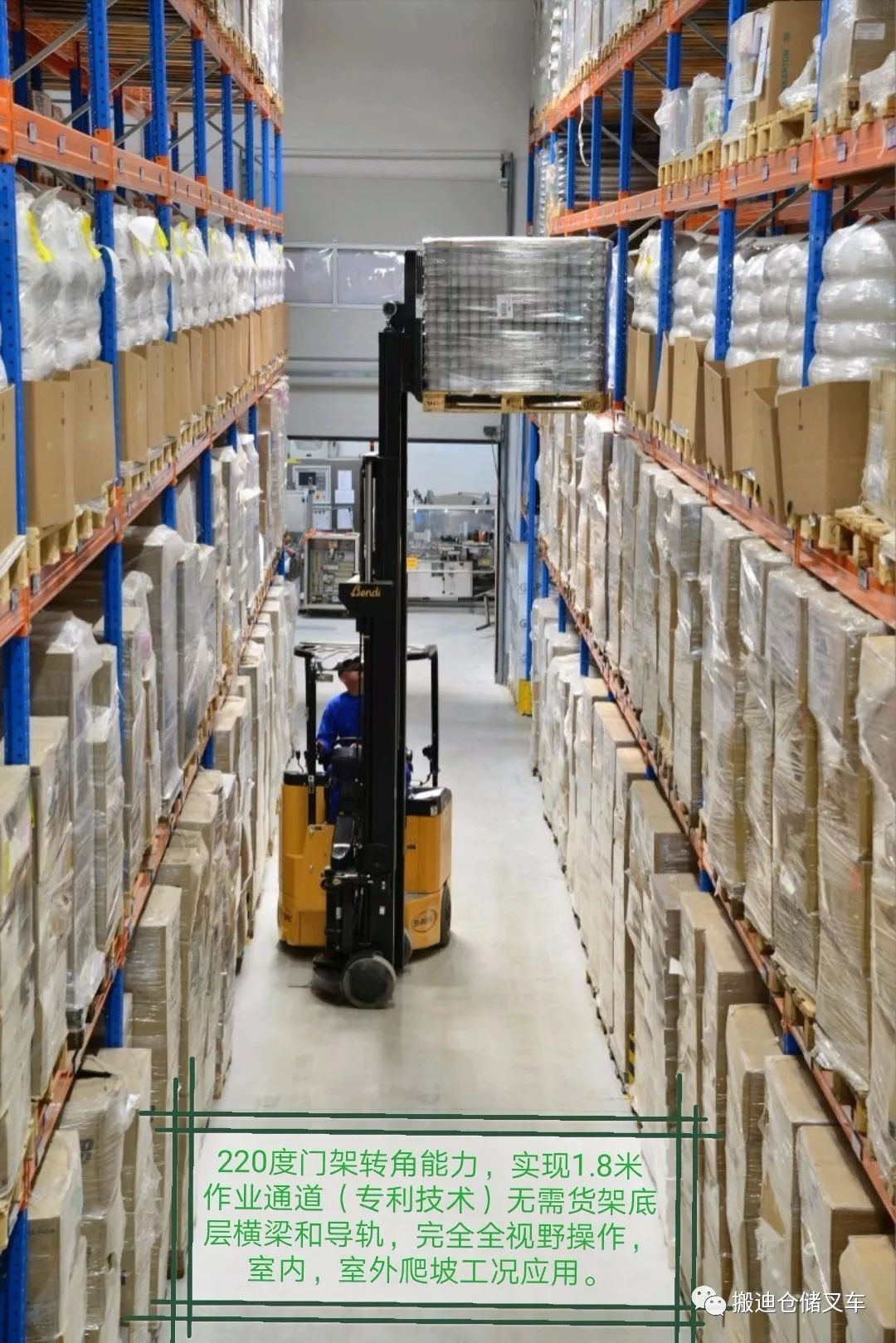 Bendi搬迪铰链叉车具备专利的铰接技术,实现1.8米的叉车作业巷道,举升高度5米-12.5米,载重1.8吨-5.8吨,不需要货架地轨,不需要货架底层横梁,追求“有限空间的极致存储”,或者“将有限的货品存储于最小的空间”,实现“单托盘储运成本最低”。