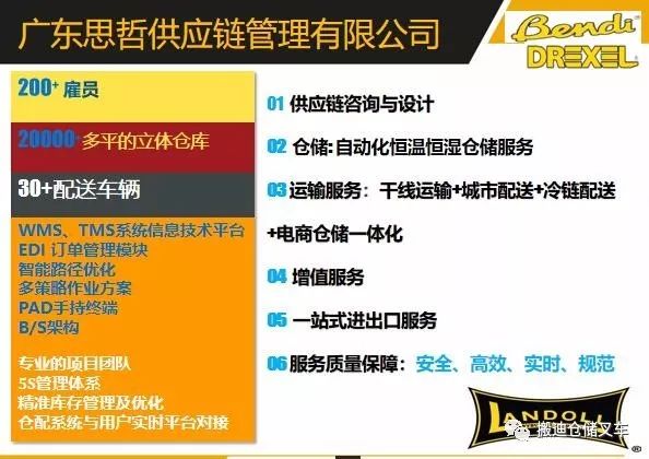 广东思哲供应链管理有限公司致力于为快速消费品行业领域的专业客户,提供卓越的供应链解决方案并提供专业的物流服务。公司有15000多平的立体仓库,拥有自有物流车辆。依托番禺基地,借助国内先进的WMS、TMS系统等信息技术平台,已建立一个覆盖全国主要城市的运作网络,为广大客户提供原材料、成品的储存、加工、包装、配送、信息处理、信息服务等供应链一体化的综合物流服务。