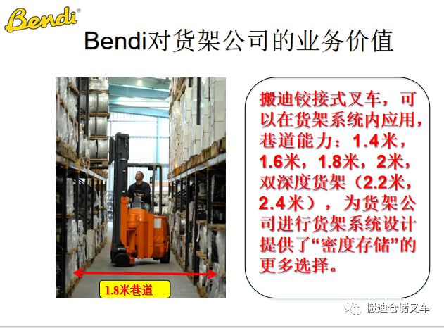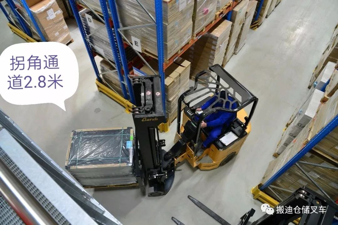 3、拐角通道:叉车驶出货架系统的通道2800mm,相比较VNA叉车驶出货架通道需要5500mm的通道数据而言,Bendi可以多放置一组2700mm的货架,实现更多货位存储。