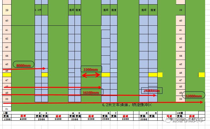 如上图:用户货架区域长*宽*高120*32*10(米),厂房立柱8*8(米)间隔均匀排布,使用前移式叉车3.3米巷道进行布局是如下的数据:10排货架,出现了4.3米,3.3米,2.2米的巷道数据,同时2.2米的巷道货位损失严重(立柱局部在通道中损失相应货位,立柱间隔8米的影响)。