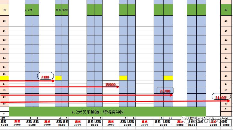 正如我们所知道的:平衡重2吨叉车4米巷道。前移式叉车3.3米巷道,立式前移2.8米巷道。但立式前移叉车和平衡重叉车不能实现8米的举升能力,座驾前移式叉车举升8米但需要3.3米巷道空间。所以上图的设计即使浪费了仓储空间20%的储能,在货架设计人员和仓库经理眼中,仍是不得不选择的“唯一布局”。(货位数字:48组*10排*10个货位*0.8货位损耗20%=3840个货位)。