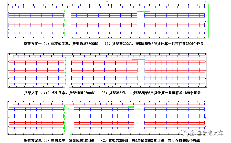 A,前移式叉车通道3.1米(货到货),6排摆放,3600个货位;