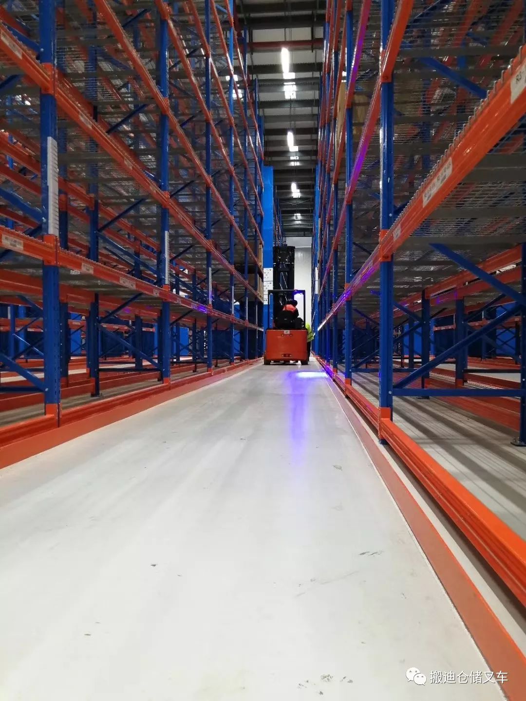 C,三向叉车(VNA)货架内不能于地面搬货作业,需要规避地面导轨,搬运需要单独提升至底层货架横梁,货架底层横梁需要离地空间高,叉车搬运底层货物需提升500mm,VNA叉车居中导轨内运行,系统内作业效率高;