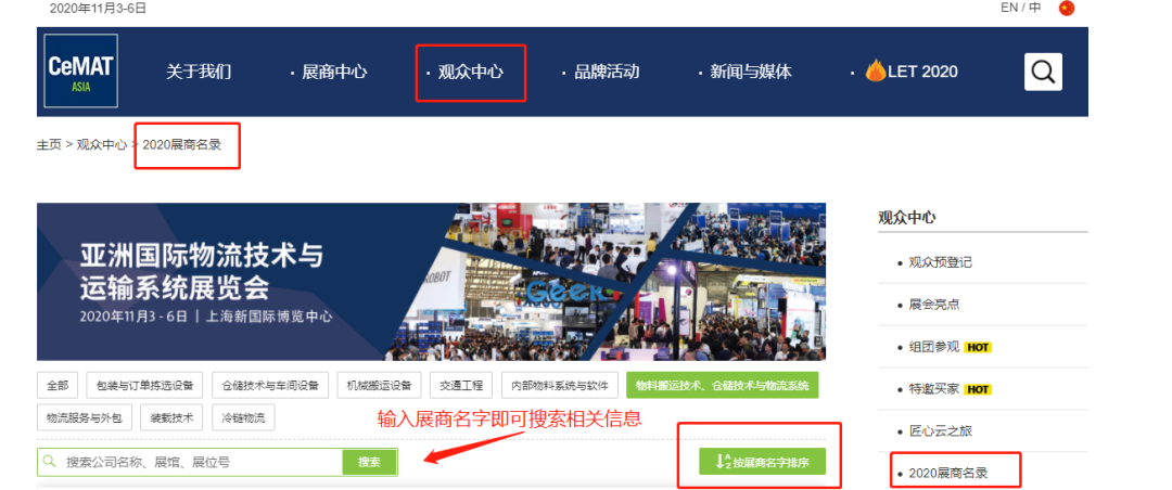 线上展商系统已上线,观众可以通过www.cemat-asia.com进行查询,具体操作见上图。